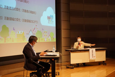 「変化するボランティア活動とこれからの市民社会」をテーマに、変化するボランティア活動と、市民社会を創るためのボランティアの役割について、現状と考え方、ボランティア・市民活動推進者がめざすべき方向性について提案しました。